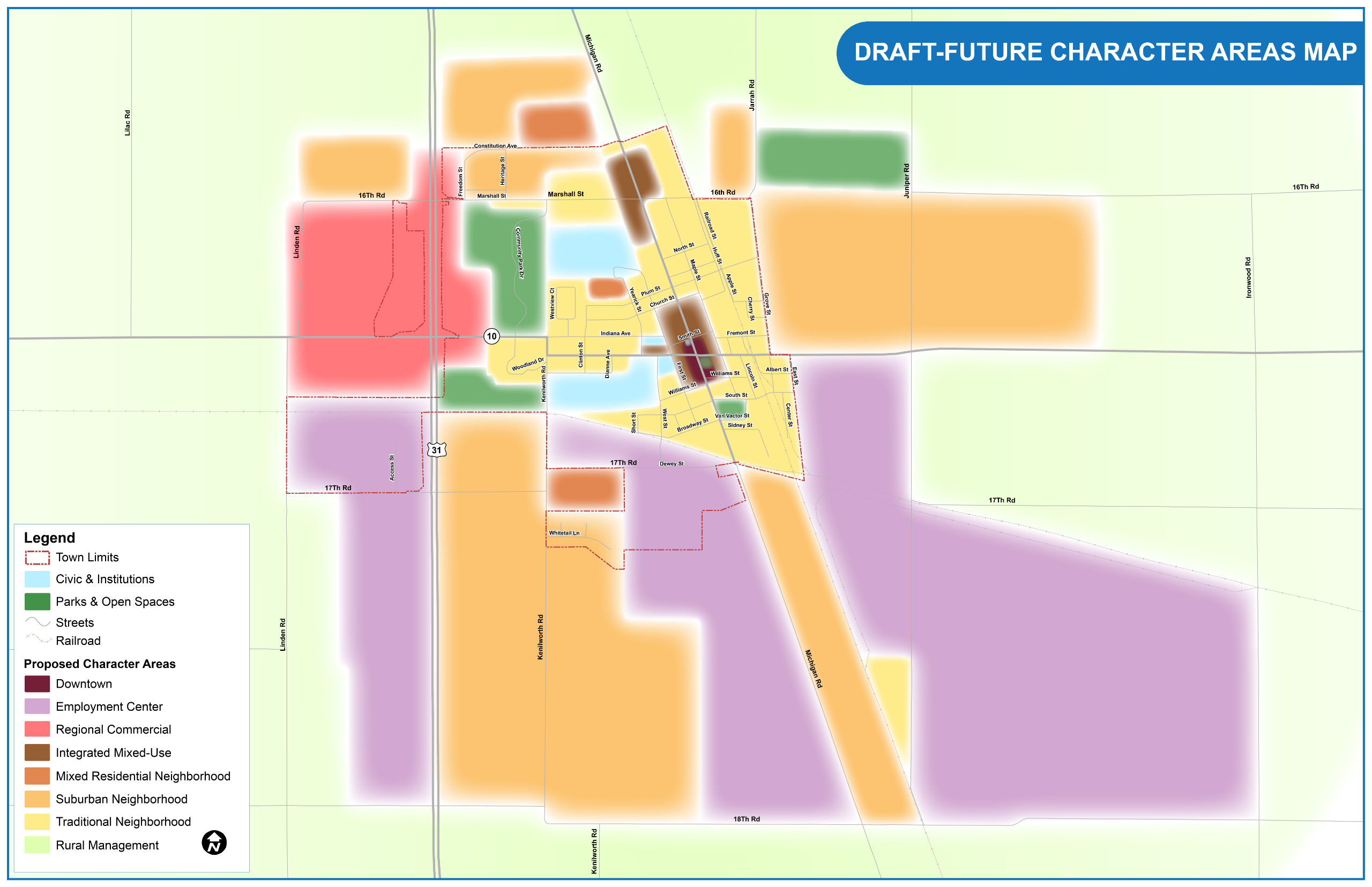 The Future Character Areas present a clear vision for Argos’ growth, guiding development to appropriate locations while preserving the distinct qualities that define each area. By defining Argos through these character areas, we reveal the distinct look, atmosphere, and purpose of the intended land uses. This approach creates a more robust foundation for thoughtful planning and zoning.